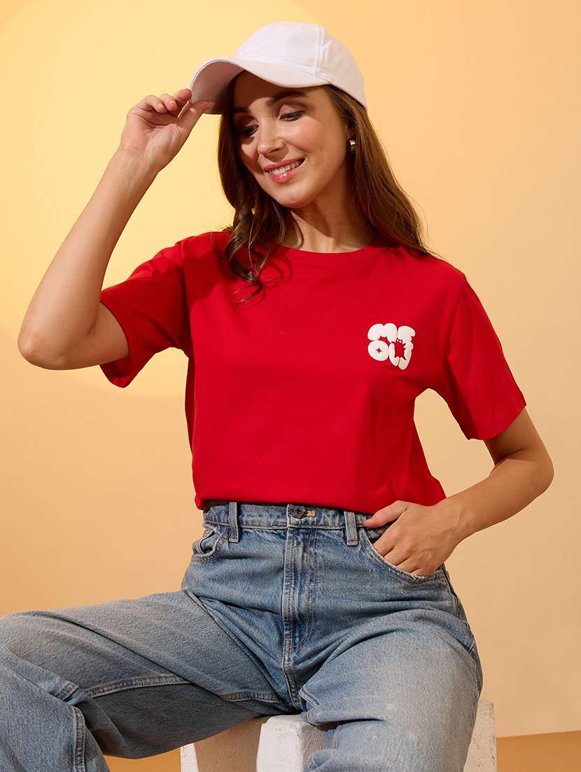 globus women red round neck short sleeves graphic print oversized crop t-shirt