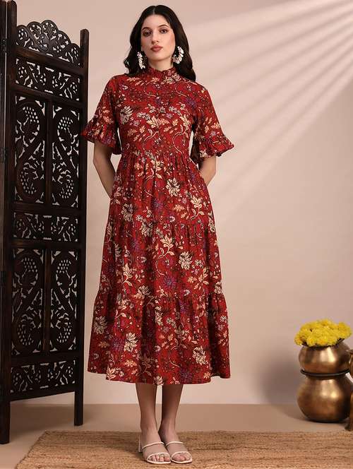 Step into effortless fusion style with this red floral print midi dress crafted from soft, breathable cotton cambric. Designed with a high neck and flounce hem sleeves, it brings a refined yet playful charm to your wardrobe. The tiered A-line silhouette adds graceful movement, while ruffle accents enhance its feminine flair. Finished with functional pockets for added ease, this dress blends comfort with standout style. Perfect for days you want to look polished without compromising on comfort.