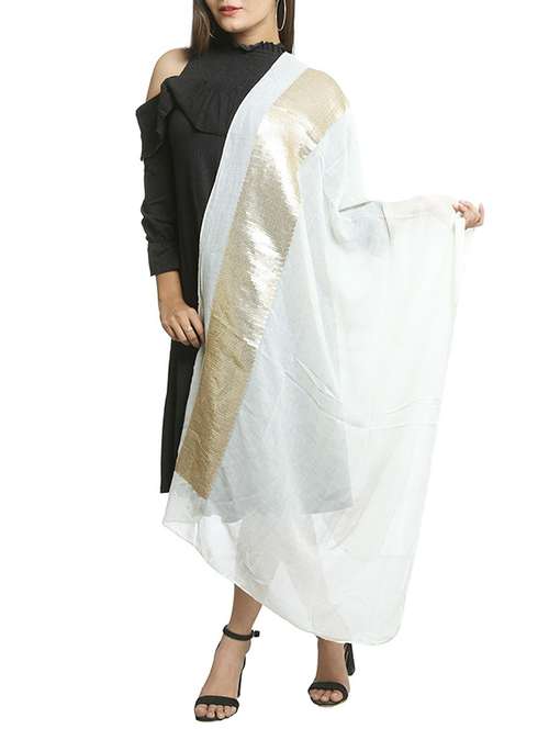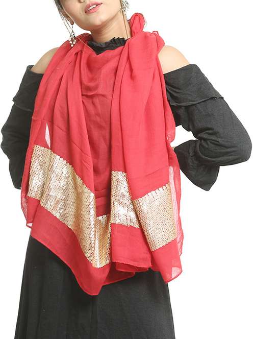 This season achieve a fresh look with any of your casual outfit by wearing this trendy solid red stole. It is fashioned using the best quality of breathable cotton fabric and is beautifully decorated with golden sequins. This women's stole is a great pick to achieve an elegant yet comfortable look. It can be paired with a solid white tee and light blue jeans to achieve a fabulous look.