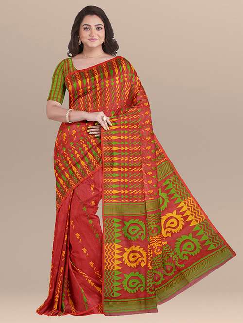 Choosing a colour which goes with every occasion, Gungun brings you this exclusive piece of dhakai jamdani saree woven intricately with yellow and green colours as contrasts. This saree contains beautiful paisley work on the pallu, temple work on the border and abstract zigzag patterns to give it an overall contemporary feel. Accentuate the look bty pairing this with matching accessories and create a real head turning attire.