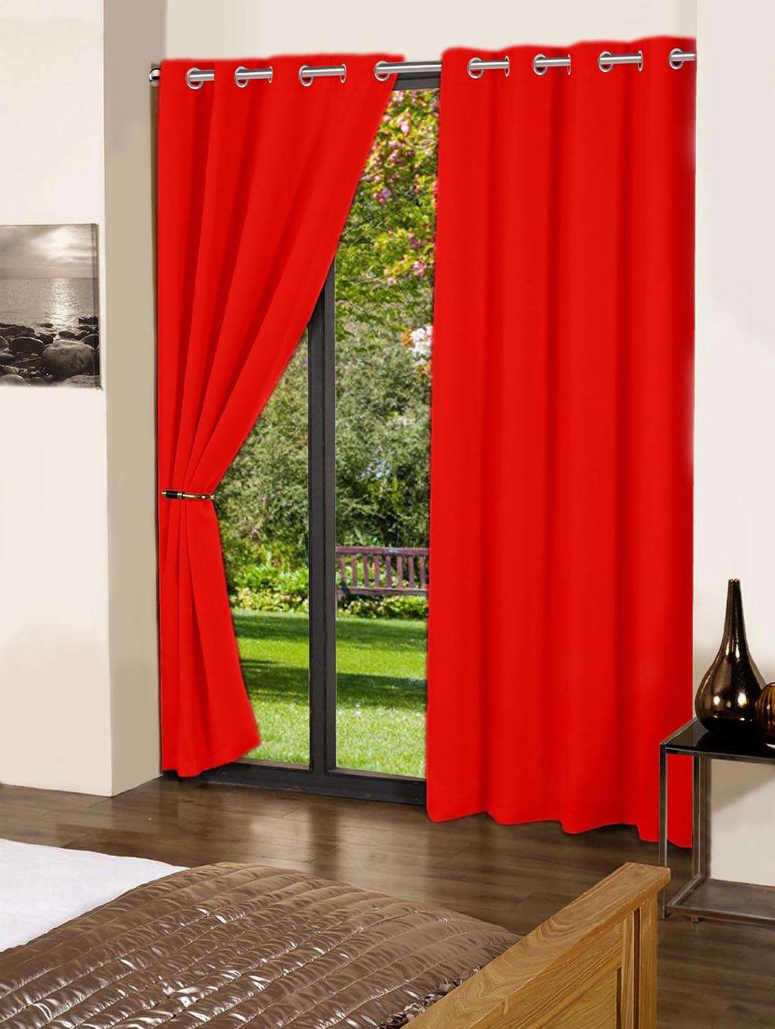 lushomes tomato plain cotton curtains with 8 eyelets & plain tiebacks for long door