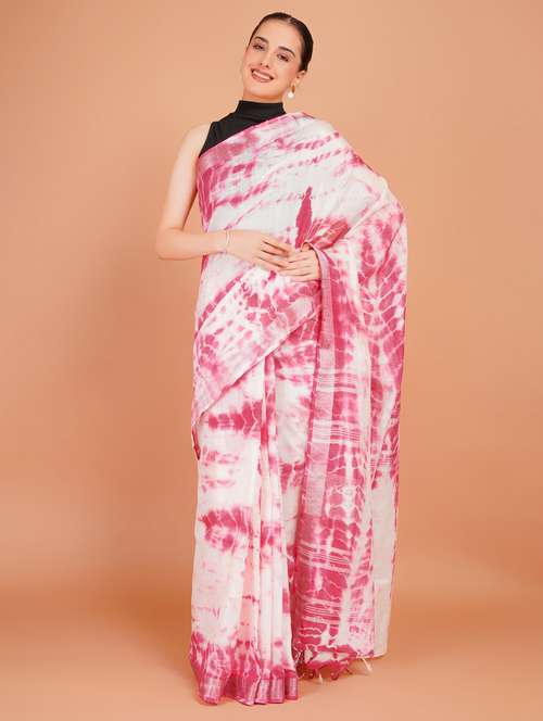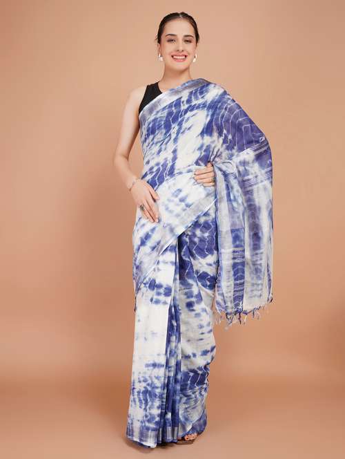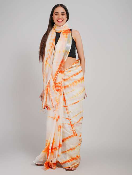 An amazing range of womens ethnic wear in soft and solid colors that looks perfect for regular wear. With beautiful designs and patterns. These apparels are very stylish and comfortable too. Get rid of the traditional look this season wearing these Sarees by Maker's Craft. This Shibori Hand Tye Dyed Saree comes with 5.5 meters length and 1 meter unstitched blouse fabric. Saree fabric- Pure Cotton with Zari, blouse fabric- Pure Cotton with Zari.