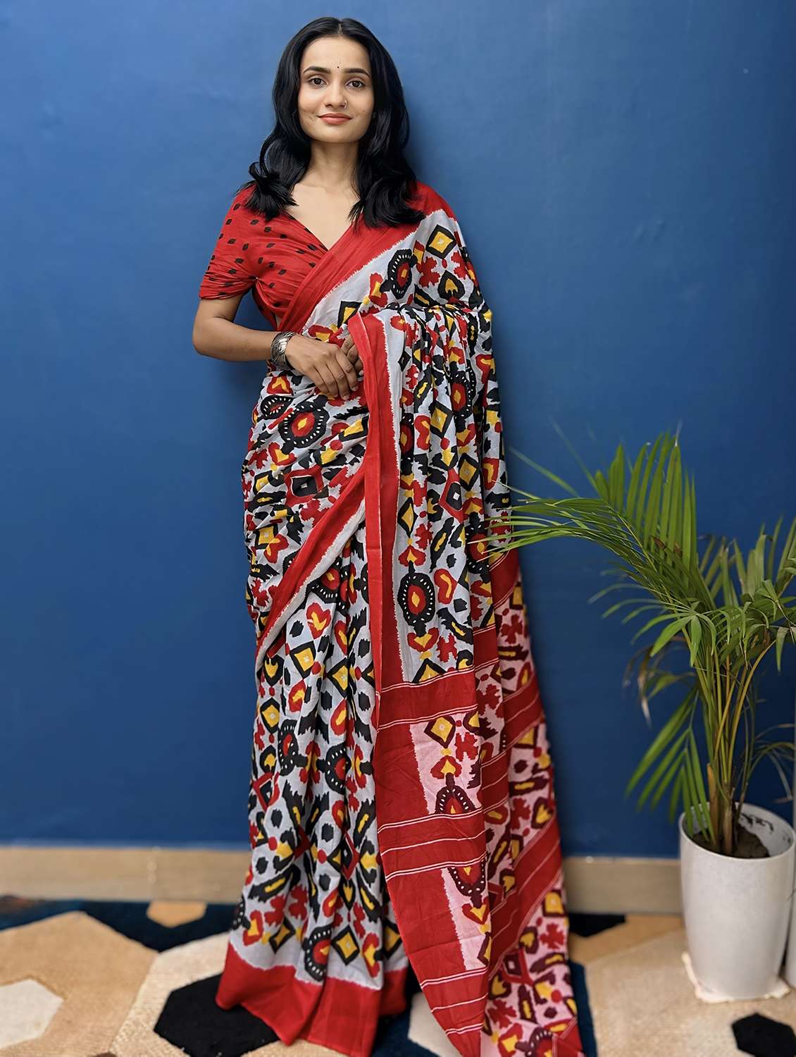 Earn admiration for your rich sense of style by wearing this Red & Grey saree from Mull Sutra. Tailored to sartorial perfection from premium quality fabric, it assures a soft and soothing touch against the skin. The printed pattern makes it a captivating choice. It also comes with an unstitched blouse piece.