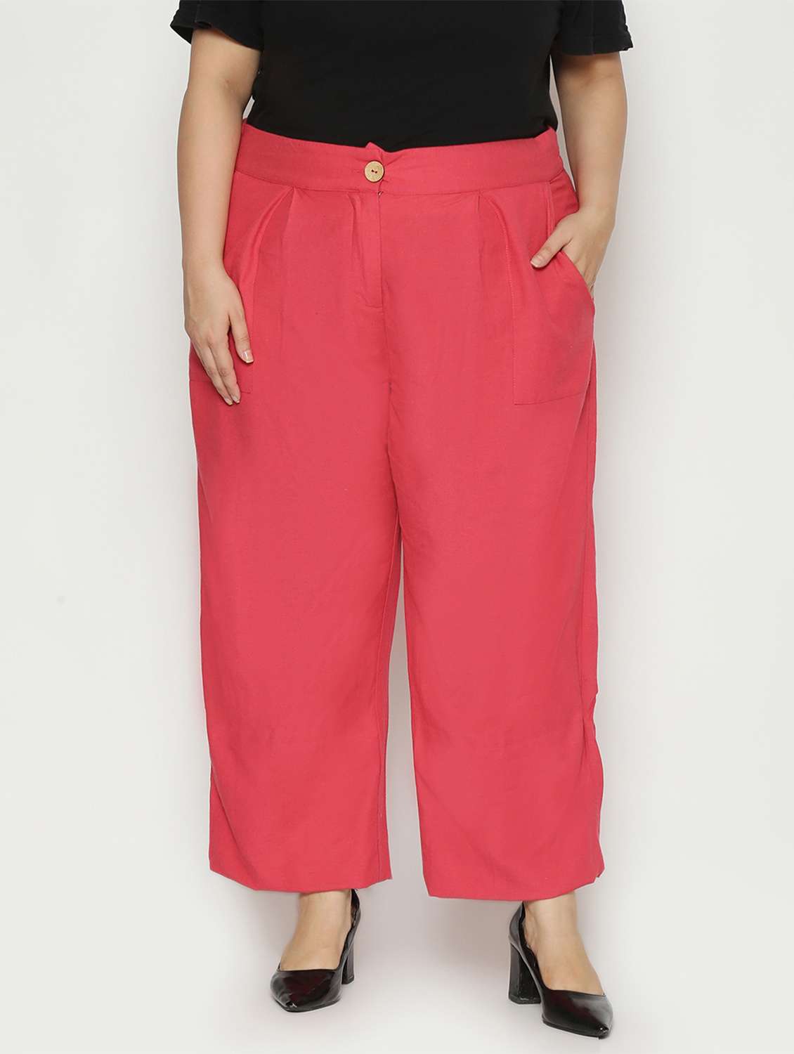 Offering effortless style with comfort, this pair of wide leg pants in peach is a must-have addition for your casual wardrobe. It feature a broad waistband for tummy support with a button closure and has 2 utility pockets on either side. It is artfully designed with front pleats to add a chic uptown touch to your look.