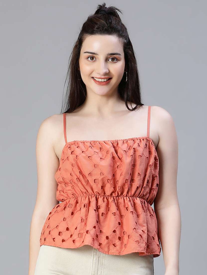 Seal the most urban yet classy look wearing this Razzle rust schiffli shoulder strap elasticated women's cotton top which is a perfect combination of ease and elegance and goes well with all-weather, reasons, and moods. Made with cotton fabric, it has a lining underneath for a comfortable fit, elasticated on the waist, adjustable shoulder straps, flared hem, and crop length. Get your party mood ready with the fabulous-looking top. HIGHLIGHTS: 1. Adjustable shoulder straps, 2. elasticated waistline, 3. Comfortable fit & quality, 4. Attractive color and look.5, Attached lining for all softness & comfort STYLING: 1. Pair well with white or black shorts or pants. 2. Wear cool sneakers, and minimal accessories with this for a trendy look, 3. Adding a shrug to it will enhance the look surely.