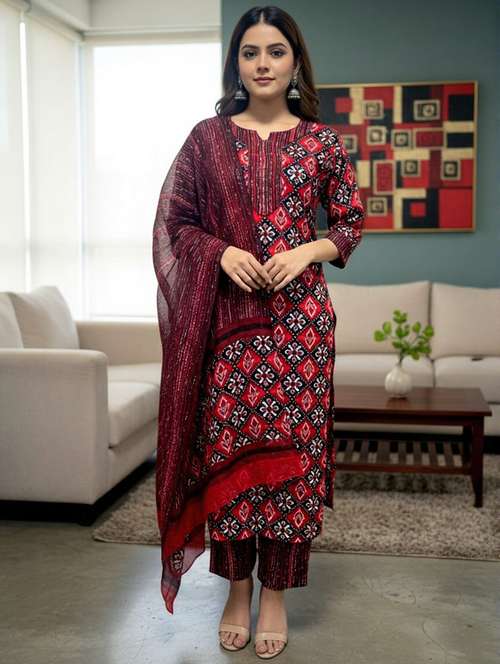 - Find gorgeous sets of ethnic wears in trending designs in red colors suitable for casual wear of occasions.
