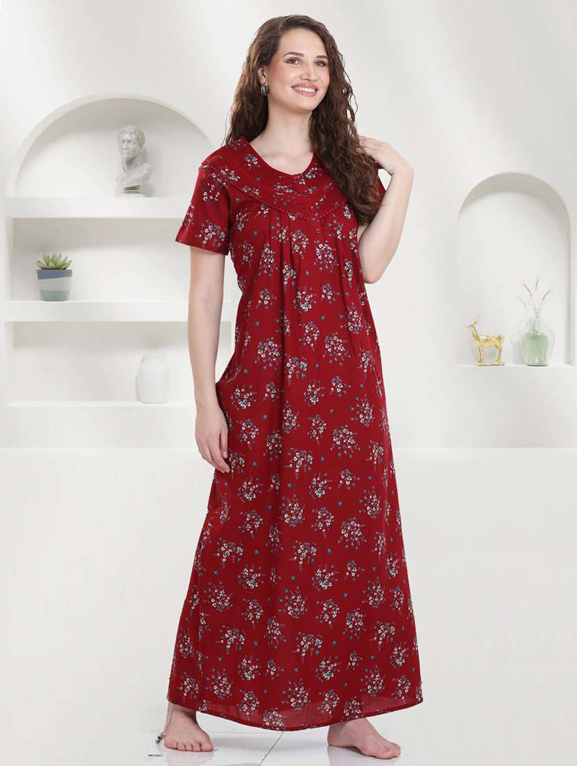 Quira Women's Cotton Printed Nighty - Half Sleeves, Round Neck, Full Length
