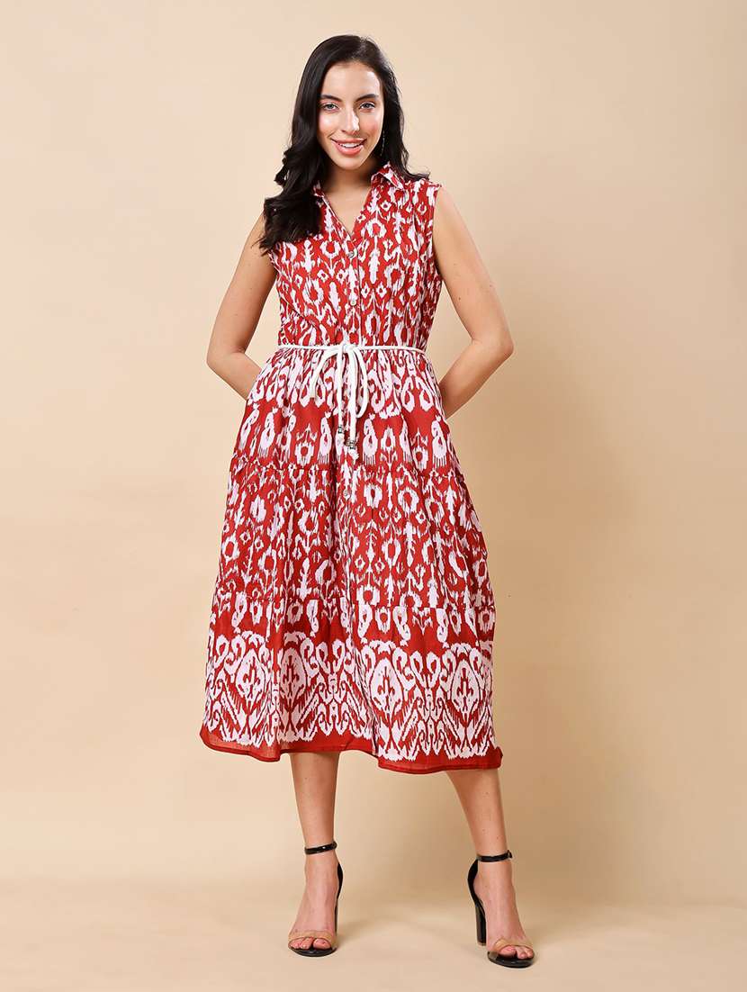 - » women ikat printed sleeveless tiered ethnic dress
