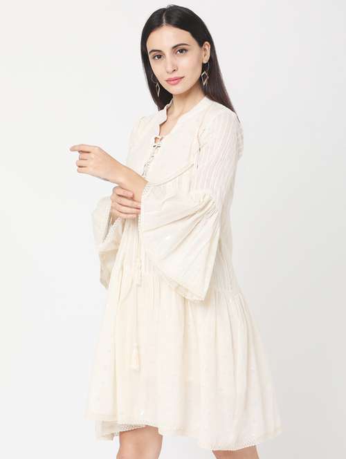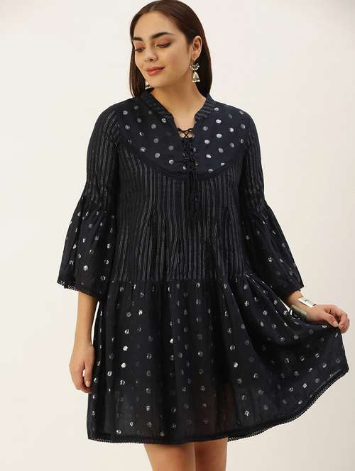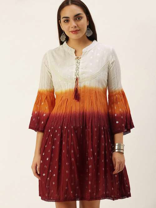 - Dress up in a soothing pattern and don this dress made of cotton material.