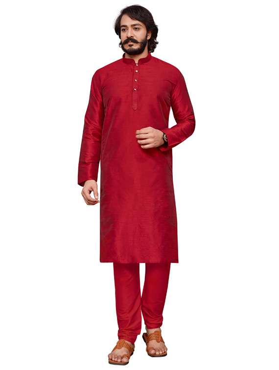 Red Cotton Silk Solid Ethnic Wear Mens Kurta set
