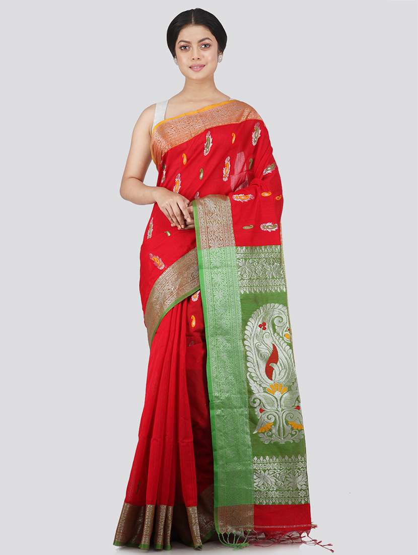 red cotton silk handloom saree with blouse - 18385023 - Very Small Image - 1
