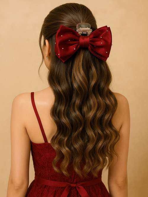 Add a touch of elegance to your everyday and party hairstyles with this premium satin bow hair claw. Crafted with a smooth, rich satin fabric in a deep wine red shade, it is delicately embellished with subtle rhinestones that add a graceful sparkle. The sturdy transparent claw base ensures a strong grip, making it suitable for both casual and festive looks. Designed in a chic Korean-inspired style, this hair claw combines functionality with fashion, making it the perfect accessory to elevate any outfit. Ideal for half-up hairstyles, parties, dinners, weddings, or even daily wear, it keeps your hair neat while adding a stylish charm.