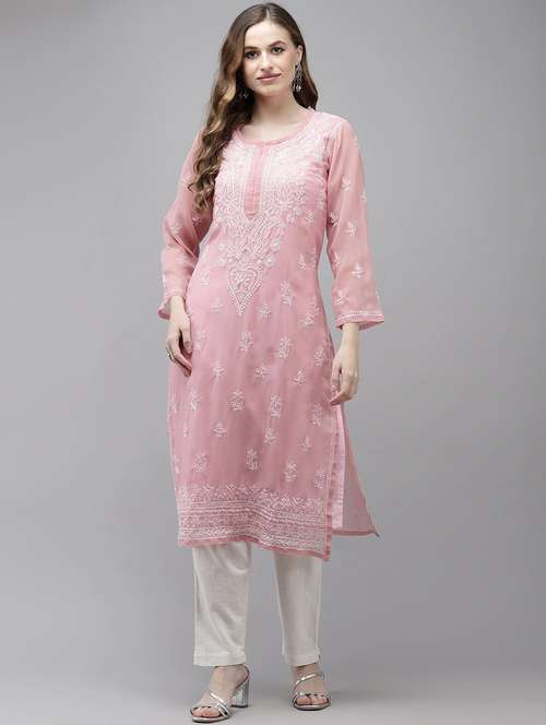 - Grab this beautiful kurta made up of georgette fabric featuring round neck designs.