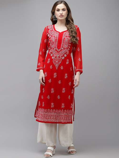 - » ada hand embroidered red georgette lucknow chikankari kurta with slip
