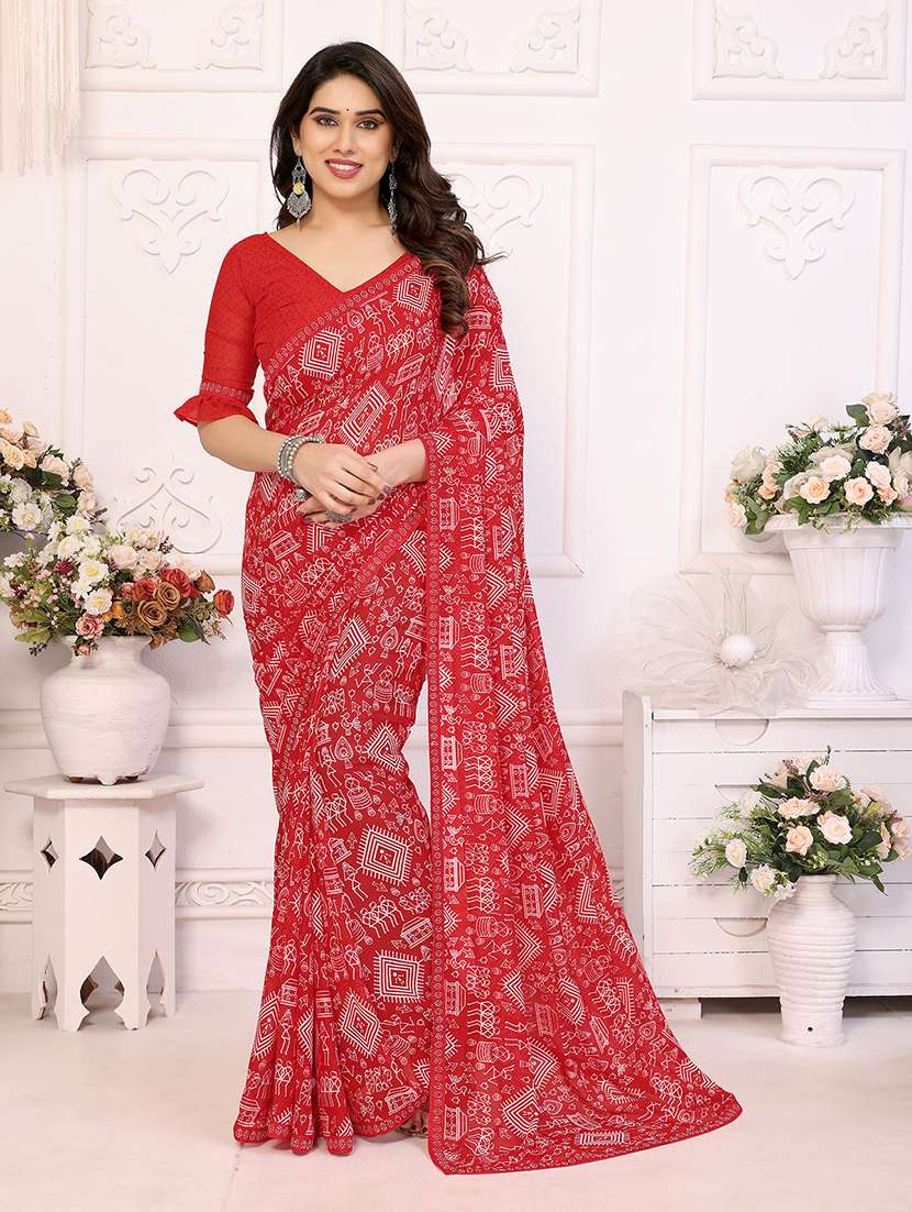 This Red Embellished geometric print saree With Diamond Lace Border combines modern design with classic elegance. The striking patterns and lace border offer a chic, sophisticated look that can easily transition from work to casual events. Its lightweight georgette fabric ensures comfort all day long, making it an ideal choice for those looking for both style and practicality in their wardrobe.