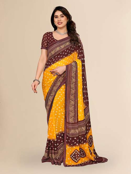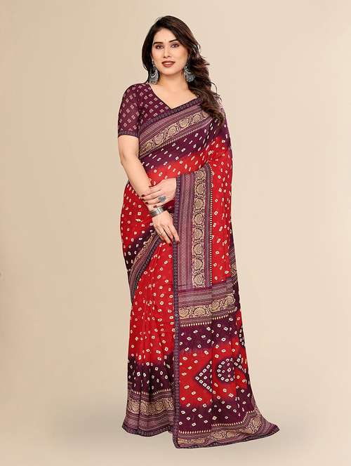 This saree beautifully combines traditional Bandhani prints with intricate self-design patterns and subtle embellishments, giving it a rich and festive appeal. Crafted from lightweight georgette fabric, it ensures a soft, flowy drape and comfortable wear throughout the day. The bold red and maroon tones add a regal touch, making it ideal for festive occasions, cultural events, or family celebrations. Pair it with traditional jewelry and a complementing blouse to complete your graceful ethnic look.