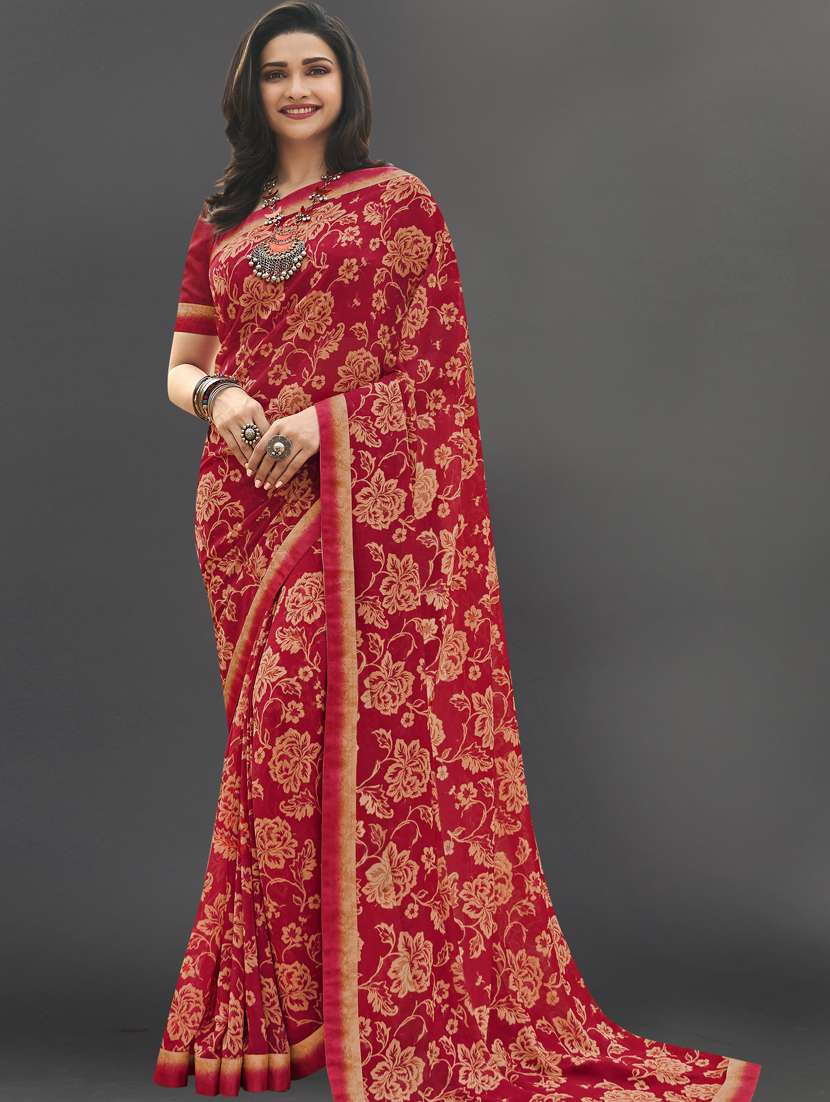 This red color georgette saree with printed design is quintessentially Indian, the saree is an outfit which women can carry off with great panache with the right material and drape, it can accentuate the beauty of women of all ages and forms. Be it a festival or a wedding, sarees are a hot favorite worldwide due to its popularity. Sarees give you the opportunity to provide a modern touch to a traditional Indian attire.