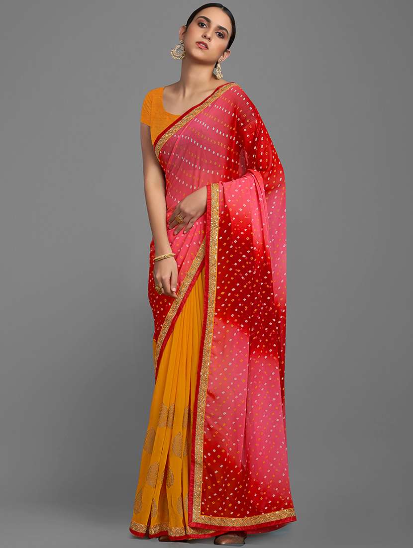 Be an absolute royalty of splendor by adoring this HIRVA bandhani print georgette saree, this saree surely creates a remarkeble look with its bandhni prints, it will surely attract showers of compliments when you wear it in parties, functions, and wedding, this beautiful bandhni printed saree will come in 5.8 meters length and 0.8 mtr unstiched blouse.