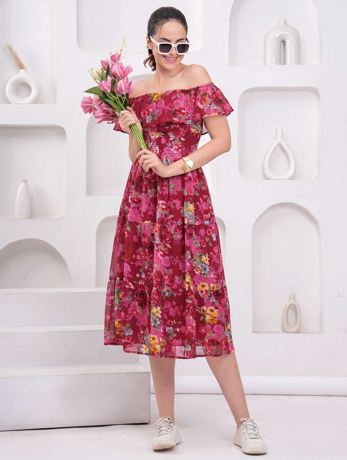 - Dress up in a soothing pattern and don this dress made of georgette material.