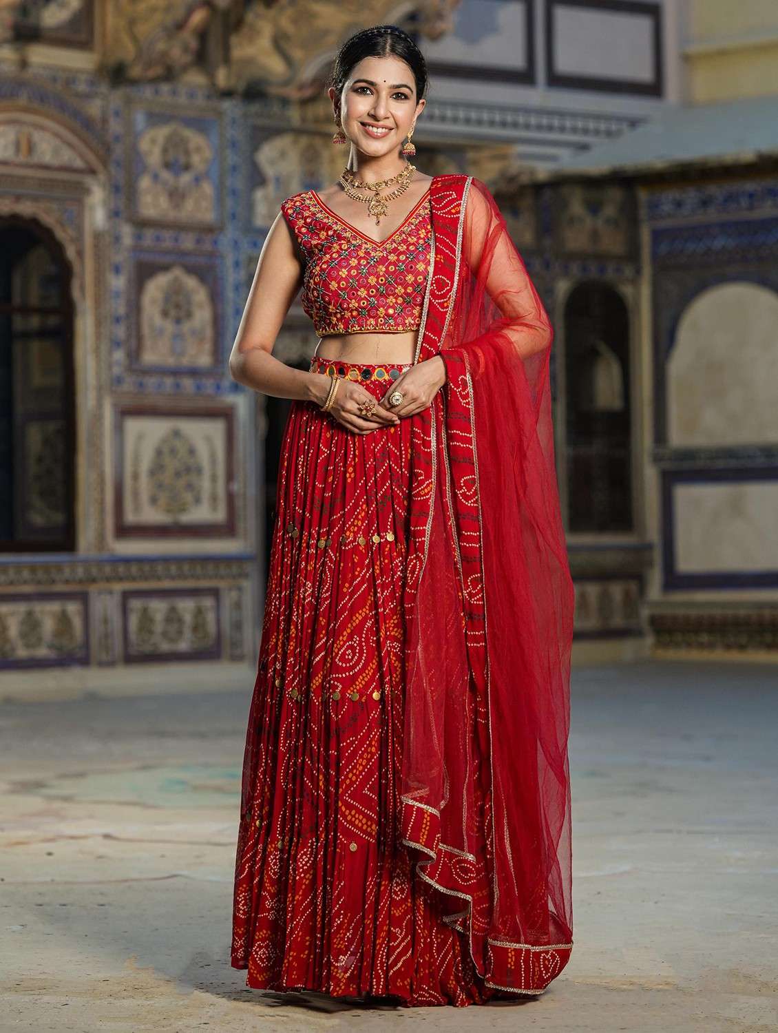 women red flared lehenga choli with dupatta