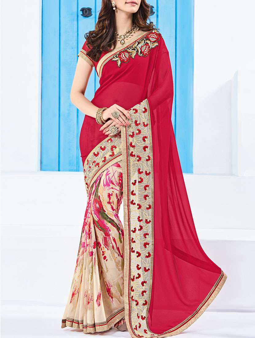 - » red embroidered half and half saree with blouse