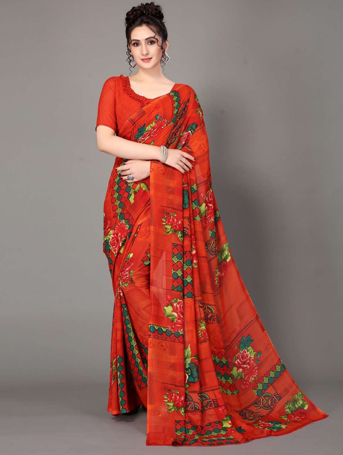- » red printed saree with blouse piece