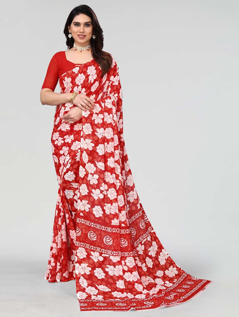 - » red floral printed saree with blouse