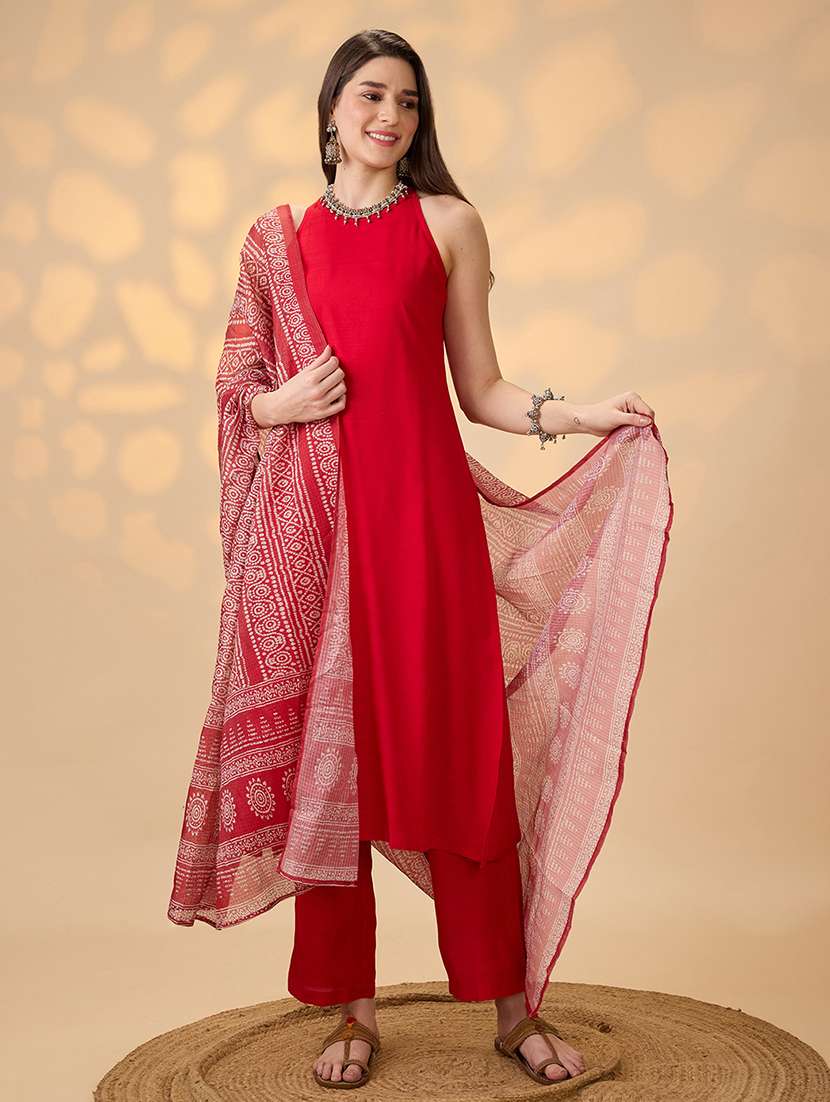 - » globus women red halter neck solid a-line kurta with pants & printed dupatta festive set