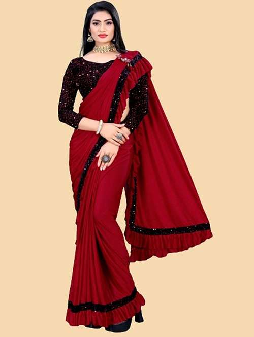 Ready to Wear Saree, Fabric: Lycra, Work : Squence Embroidered, Saree Length of 5.25 meters in Red Color, The saree comes with a blouse piece 0.75 meter Velvet Squence Embroidered Work. It is unstitched and can be altered according to your fit and style that you require