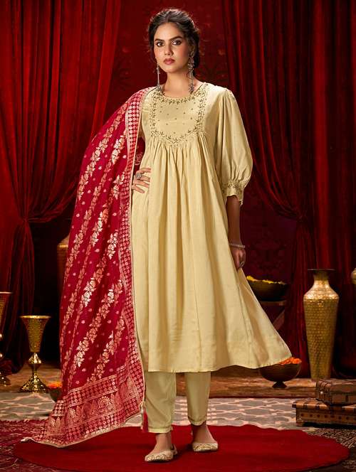 - Find gorgeous sets of ethnic wears in trending designs in red colors suitable for festive wear of occasions.