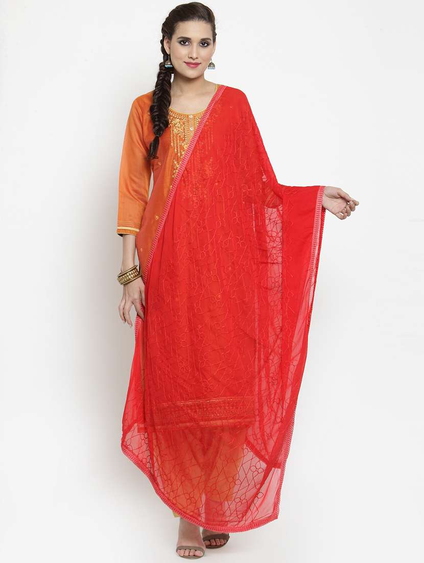 - » red self designed embroidered lace border dupatta
