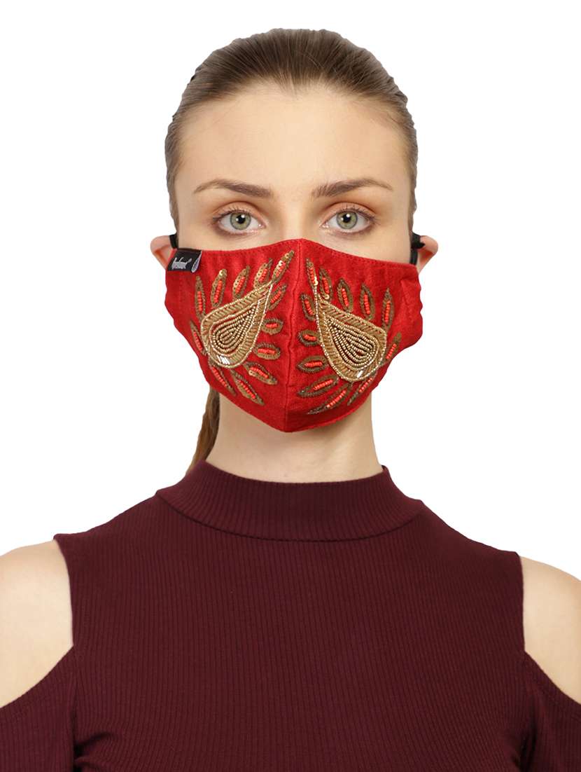 Anekaant 3-Ply Red & Gold Art Silk Embellished Fabric Fashion Mask