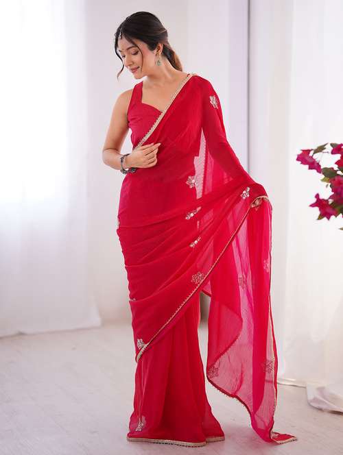 This Red organza saree, adorned with intricate floral work featuring sequins, beads, and stones, complemented by elegant lace detailing. Crafted from smooth and lightweight organza fabric, it offers a graceful, sheer drape that moves beautifully. The saree comes with an unstitched heavy mono Banglori plain blouse piece with a lace border, giving you the freedom to customize the fit and design. Perfect for parties, evening events, and festive celebrations, this saree blends classic charm with a touch of modern appeal.