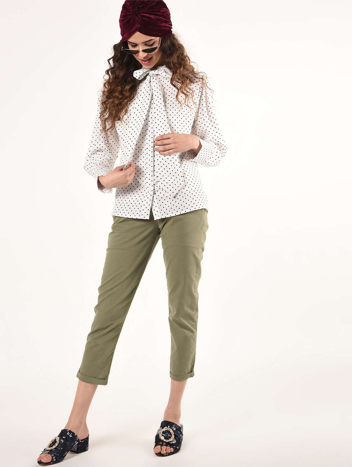 women white printed tie-up neck top