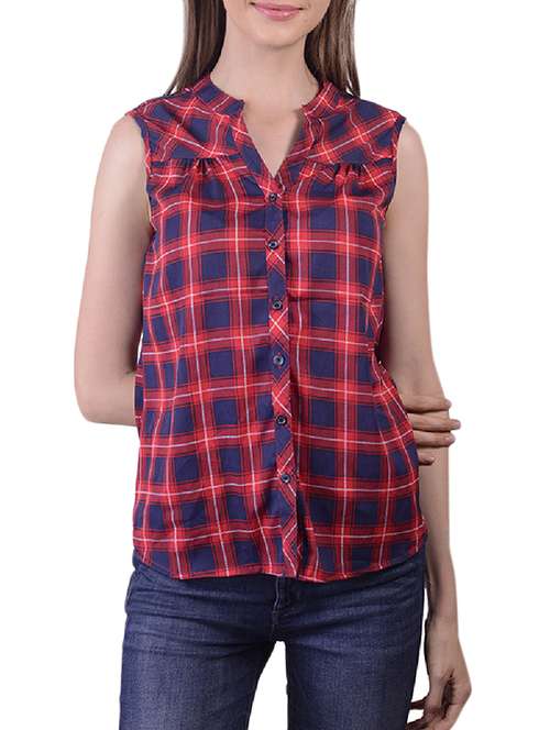 - » checked mandarin collar sleeveless shirt