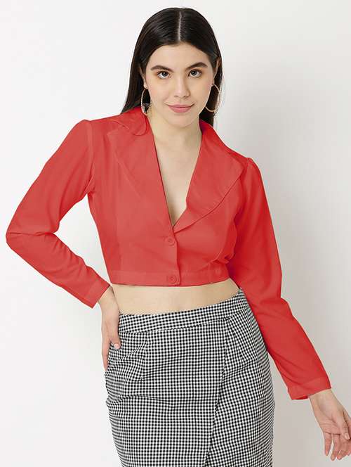 Introducing our Women's Red NS Lycra Lapel Neck Blazer Crop Top, a perfect blend of sophistication and contemporary style. Crafted from high-quality Lycra fabric, this crop top features a lapel neck design, creating a chic fusion of blazer elegance and crop top trend. The versatile Red color adds a touch of refinement, making it suitable for both formal and fashionable occasions.