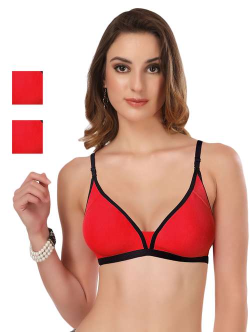 Featherline plunge neck non-padded bra that has been made using soft polycotton fabric. Contrasting black-coloured fabric at the centre gore, along the sides of the cups and the underbust adds to its look and style. It is completely wire-free and ensures a very comfortable and poke-less experience. The bra is fitted with non-padded cups that nicely complement low-necked outfits. Its plunging neckline makes it ideal for low-neck outfits. These bulk-free moulded cups offer no-show confidence. Detachable multiway straps to style the bra in multiple ways.
