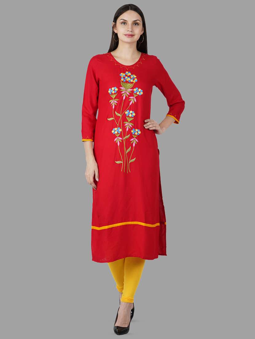 - Grab this beautiful kurta made up of rayon fabric featuring round neck designs.