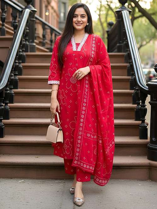 - Find gorgeous sets of ethnic wears in trending designs in red colors suitable for casual wear of occasions.