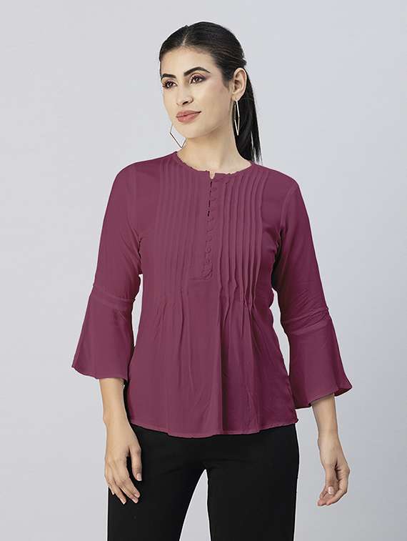 *Includes: This Clothing Consists Of 1 Top (Any Accessories Worn By The Model Are Not For Sale)*Material: Viscose Rayon Gsm: 119*Top Length: 26 Inches (Approx.)*Model Stats: The Model In The Image Is 178 Cm Tall, And Bust 34\ Inches Is Wearing Size - (S) Small*Features: Bell Sleeves, Flared Hem, Buttoned, Pleated, Round Neck, Waist Length, Lightweight And Solid Pattern*Care: Medium Machine Wash, Warm Iron, Iron While Damp. (After Washing Do Not Dry The Fabric On High Heat And Do Not Dry Fully. Medium Heat Is Best And Removes Just Prior To Being Completely Dry)*Size Information: Please Refer To Our Size Chart Before Making The Purchase. If Your Size Is In Between Two Sizes, We Recommend That You Choose A Larger Size.*Tags: Tops For Women, Solid Tops For Women, Bell Sleeves Ops For Women, Round Neck Tops For Women, Buttoned Tops For Women, Tops For Women 2023, Flared Tops For Women