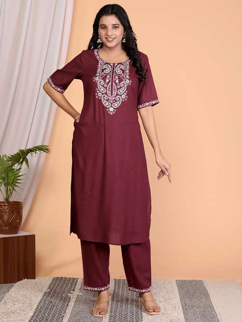 - Find gorgeous sets of ethnic wears in trending designs in maroon colors suitable for casual wear of occasions.