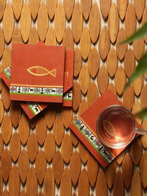 - » exclusivelane 'the auspicious fish' warli hand-painted wooden coasters in brick red (set of 4)