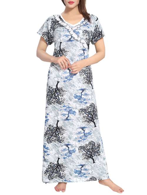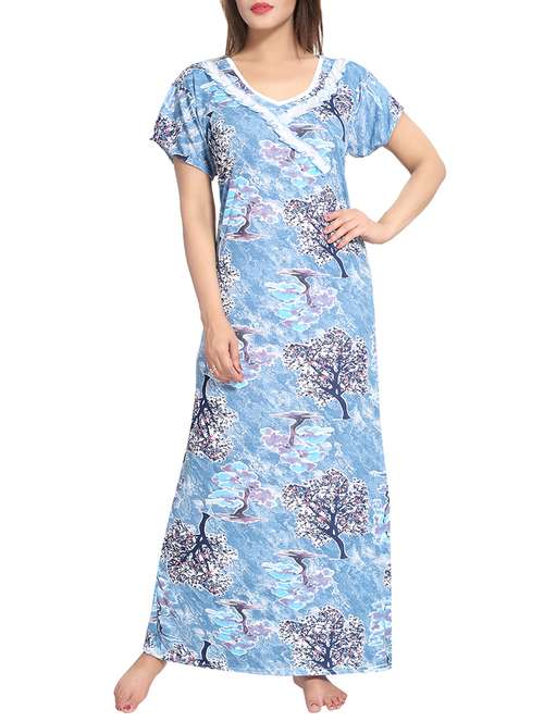 Feel relax with this Night Gown from Be You Fashions. Made up of Soft & Top quality Serena Satin. It has beautiful summer prints with frill design on the neck. This Nighty is the ultimate blend of comfort and style. br Length Full (approx-55 inches) br Size-Free (comfort fit to bust 32-38 inches)