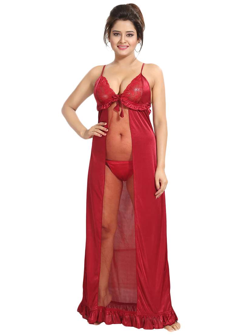 Make your night more romantic with this nighty from Be You. It has frills on chest & bottom hem; soft net in front. It has adjustable shoulder straps and elastic at back for perfect fitting. br Color-Red; Pattern-Solid; Length- Full (approx-55 inches) br Size-Free (Fits to Bust: 32-36 inches)