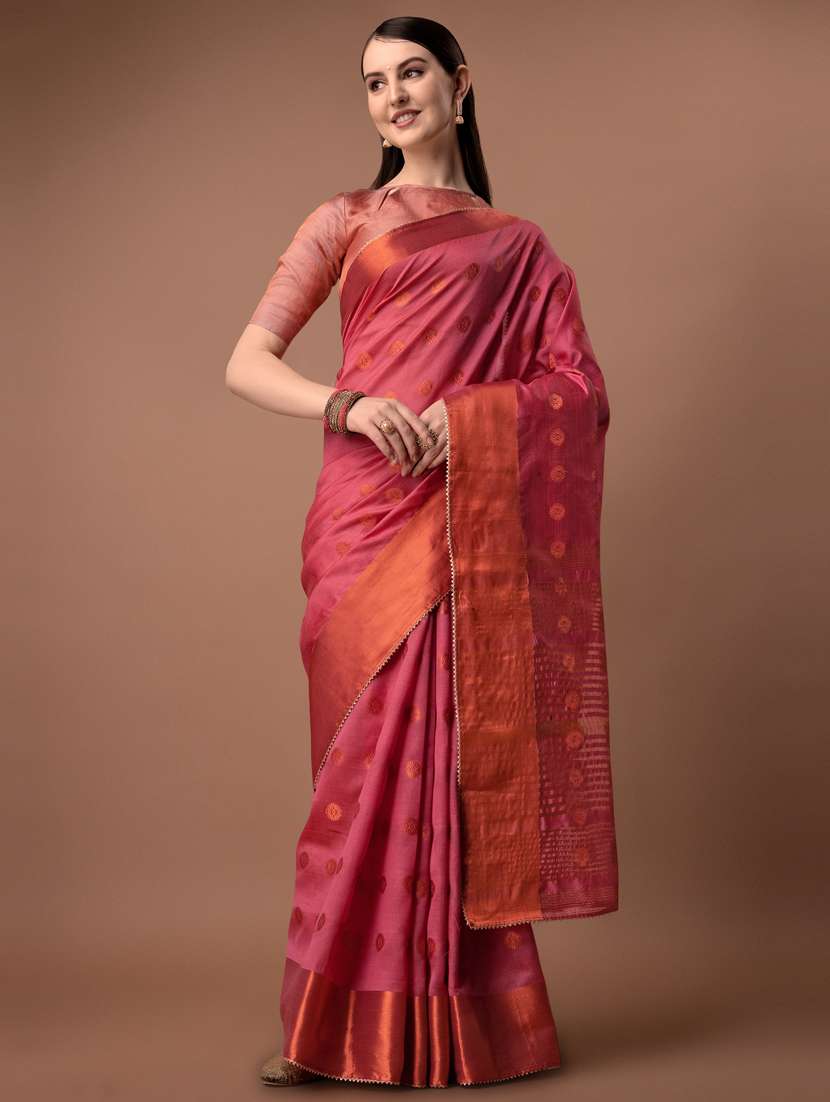 An Exclusive Silena Hand & Loom Product from the House of Art Decor Fashions marketed exclusively online by Studio Venus. A maintenance-free product comprising Kasab Zari Weaves, featuring good color-fastness. Feel free to handwash. Saree Fabric: High-quality Polyester-based Faux Silk // Blouse Fabric: Faux Silk Alternate Fabric/Work-type Names: Banarasi Art Silk // Jacquard Woven Kanjivaram Style Sari // Zari Woven Length: Saree: 5.30 meters // Blouse-piece: 0.70 meters Colour: Saree Color: Bronze Pink Red // Blouse Color: Multi Color. Work: Woven Saree // Blouse-piece: Attached Woven Blouse-piece Occasion: Formal Wear // Evening Wear // Traditional Wedding // . Included Contents: Saree with Attached, Unstitched Blouse Piece Product Colour may slightly differ from the one that appears in the images or videos presented due to the limitation of photographic/display technologies. The blouse worn by the model, ornaments, purses or any other accessories in the image are for style-representation only. The blouse-piece image has been separately provided for the assessment.