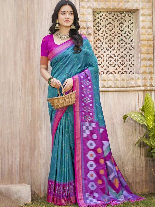 This regal red Pochampalli soft silk saree features a sophisticated grey pallu adorned with vibrant ikat designs, ideal for festive events, weddings, and cultural functions.