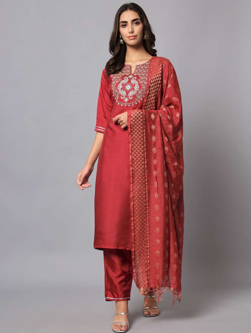 - Find gorgeous sets of ethnic wears in trending designs in red colors suitable for festive wear of occasions.