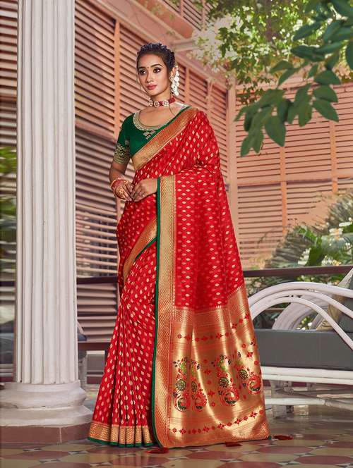 - » red self design woven saree with blouse
