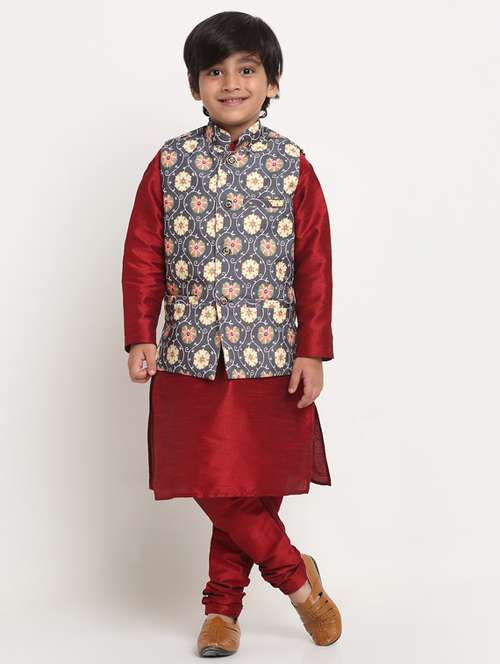 boys solid kurta pajama with printed nehru jacket set