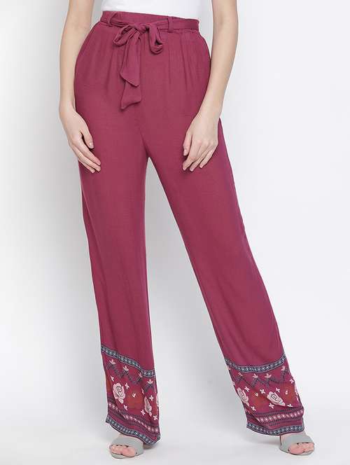 Make a super fashion gaze around you with Sizzer wine floral print women pant and look super new. It is made with viscose fabric, designed for all seasons. For a trendy look, it has an elasticated waist along with a tie-knot belt to highrise the waist look, floral print on the border o the pant, pockets on the sides, and a straight hem. Pair this with a white or black color top for a complete look. Don, this to dazzle your look